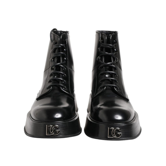 Dolce & Gabbana Black Leather Logo Ankle Boots Lace Up Shoes