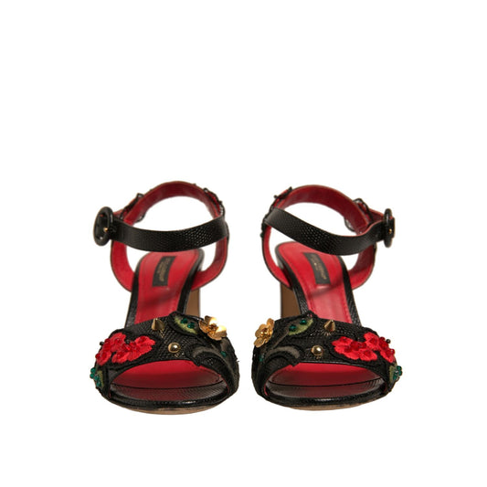 Dolce & Gabbana Black Embossed Carnation Heeled Sandals Shoes