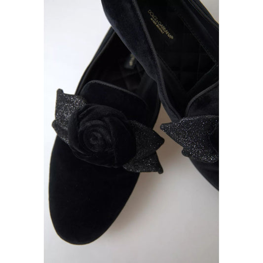 Dolce & Gabbana Black Velvet Flats Bow Young Queen Shoes