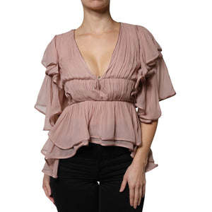 Alberta Ferretti Brown Silk Short Sleeves V-neck Pleated Top