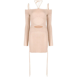 ribbed-knit mini dress from ANDREADAMO featuring blush beige, knitted construction, ribbed knit, cut-out detailing, semi-sheer panels, halterneck tie fastening, square open back, long sleeves, bodycon design, thigh-length and straight hem. Knit ribbed mini dress Size and Fit - This piece fits true to size. We recommend you get your regular size. Model is 1,75m / 5ft 8in wearing size S