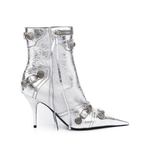 Cagole 90mm metallic ankle boots from BALENCIAGA featuring silver-tone, calf leather, metallic finish, silver-tone stud detailing, zip detail, side zip fastening, ankle-length, pointed toe and high stiletto heel. Conscious: We've partnered with Good On You – an ethical agency that rates how sustainably brands perform. This item comes from a brand that performs well in relation to their impact on the planet.. Le Cagole leather boots Size and Fit - Heel 3,5 in / 9 cm