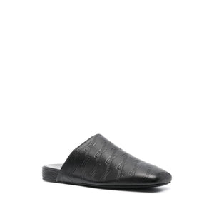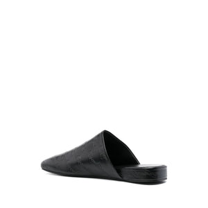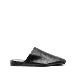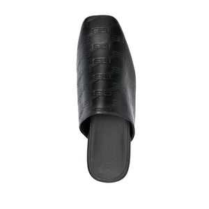 حذاء مفتوح من الجلد بشعار منقوش من BALENCIAGA، مصنوع من جلد العجل باللون الأسود، ومطبوع عليه شعار منقوش بالكامل، وتصميم سهل الارتداء، ومقدمة مستديرة ونعل جلدي مسطح. المقاس والمقاس - كعب 0.8 بوصة / 2 سم