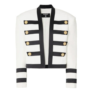 Elevate your ensemble with the quintessentially chic Balmain classic white blazer. A statement piece that exudes sophistication, this blazer features standout faux gold buttons that add a touch of opulence to any outfit. Perfectly tailored to showcase your silhouette, it’s a must-have for the fashion-forward individual. Indulge in the elegance of French design and superior craftsmanship that Balmain is celebrated for.