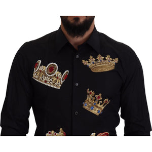 قميص دولتشي آند غابانا الأنيق ذو قصة ضيقة باللون الأسود مع تطريز على شكل تاج