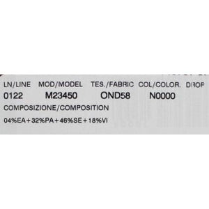 - المواد: 46% حرير، 4% إيلاستين، 32% بولي أميد، 18% فيسكوز
