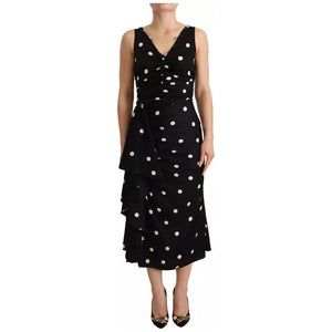 فستان دولتشي آند غابانا من الحرير الأسود المنقط بفتحة رقبة على شكل حرف V وقصّة ميدي
