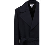 Double Cotton Canvas Trench Coat in Bottega Veneta Blue. Front fastening with covered buttons, removable belt, two side welt pockets, Ulster collar, small vent on the back, unlined.