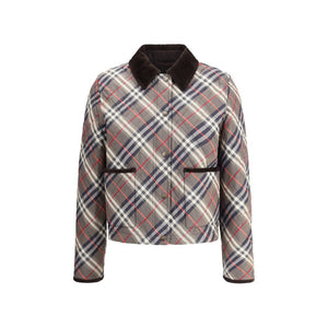 Crafted in England by cotton twill with a Burberry Check motif, the Burberry Quilted Jacket combines elegance and functionality. The cropped, regular-fit model is finished with a corduroy collar and details. Featuring a zip and press stud fastening, it has side patch pockets. An Equestrian Knight Design label on the side adds an iconic touch to the piece.