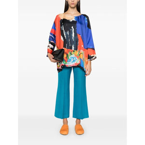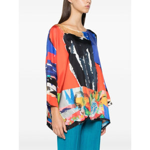 blue/multicolour silk abstract pattern print round neck long sleeves straight hem Printed silk blouse Size and Fit - This piece fits true to size. We recommend you get your regular size. Model is 1,75m / 5ft 8in wearing size UNI
