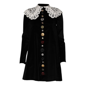 Gorgeous brand new, 100% Authentic Dolce & Gabbana black velvet dress featuring a distinctive white lace collar and a row of assorted decorative buttons down the front. Lace collar velvet dress. This style incorporates a vintage aesthetic with its high neck and Peter Pan-style lace collar.