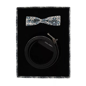 Dolce & Gabbana White Blue Silk Bowtie Leather Belt Gift Box Set