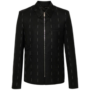 logo-print shirt jacket from Givenchy featuring black, all-over logo print, classic collar, front zip fastening, long sleeves, chest welt pocket and straight hem. Wool zipped jacket Size and Fit - This piece fits true to size. We recommend you get your regular size. Model is 1,84m / 6ft 1in wearing size 48 (IT)