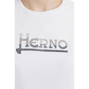 Elevate your everyday style with this chic Herno classic tee. It’s not just any t-shirt; it’s a statement piece adorned with dazzling rhinestones to create the Herno logo that catches the light and everyone’s attention. Crafted from a premium blend of cotton and elastane, it offers comfort with a luxurious feel. Graced with quality that speaks for itself, this white top is an essential in any fashion-forward wardrobe, embodying casual sophistication.