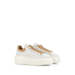 white leather front lace-up fastening contrasting heel counter logo patch at the tongue round toe flatform sole H-Stripes leather sneakers Size and Fit - Heel 2 in / 5 cm