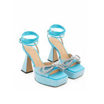 Light Blue Platform Sandals with Crystals Double Bow Mach & Mach. Square toe, crystal band with double bow, covered with crystals on the platform and heel. Bell-shaped heel, ankle strap and drawstring fastening. Platform height: 3,5 cm-Interior skirt:24MAR11