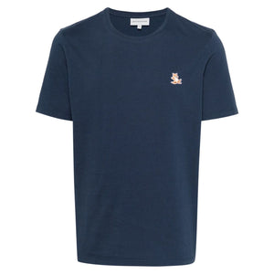 navy blue cotton jersey texture crew neck short sleeves signature Chillax Fox motif appliqué internal logo tag straight hem. Chillax Fox cotton t-shirt Size and Fit - This piece fits true to size. We recommend you get your regular size. Model is 1,84m / 6ft 1in wearing size M