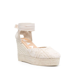 light beige crochet round toe branded leather insole 100mm braided raffia wedge heel rubber outsole tie-fastening ankle strap Yucatán crochet cotton wedge espadrilles Size and Fit - Heel 3,7 in / 9,5 cm Platform 1,2 in / 3,05 cm