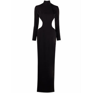 Black open-back high-neck cut-out evening gown from Mônot featuring open back, cut-out detailing, high neck, concealed rear zip fastening, long sleeves, rear slit and floor-length. Slit detail silk crepe long dress Size and Fit - This piece fits true to size. We recommend you get your regular size. Model is 1,75m / 5ft 8in wearing size 4 (US)