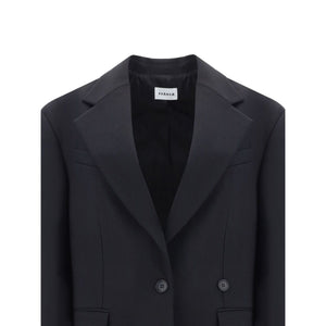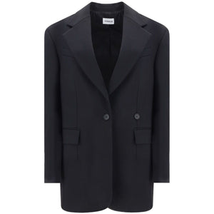 black virgin wool blend peak lapels front button fastening long sleeves buttoned cuffs chest welt pocket two front flap pockets straight hem Wool single-breasted blazer jacket Size and Fit - This piece fits true to size. We recommend you get your regular size. Model is 1,75m / 5ft 8in wearing size S