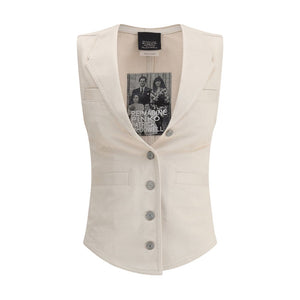 Cotton Vest by Jil Sander, made of denim with a mélange pattern. It features a classic lapel, front button closure and two welt pockets on the front. Two ribbons at the back and an asymmetric hem complete the design, giving the garment a distinctive and modern touch, perfect for a contemporary and versatile look.