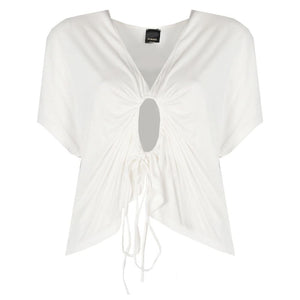 Elevate your wardrobe with the PINKO White Jersey Top, a seamless blend of sophistication and modern flair. Crafted in Italy, this stunning piece boasts a V-neck design and features an artful gathered opening at the front, complete with a tie thread for an adjustable fit. The flowing viscose material promises both elegance and comfort. Perfect for those who covet a chic yet bold look.