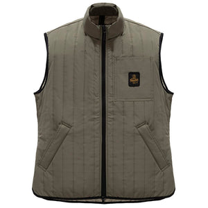 Elevate your style quotient effortlessly with Refrigiwear’s quintessential quilted nylon vest, a testament to sartorial sophistication. Blending functionality with fashion, this vest boasts a streamlined zipper closure and convenient side pockets alongside a practical breast pocket—all tailored for the modern man. Its rich green hue embodies a bold statement of contemporary trendsetting.