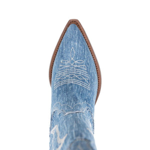 light blue washed denim Western style double pull-tab at the opening calf-length slip-on style pointed toe branded leather insole 35mm block heel leather and rubber sole Denim texan boots Size and Fit - Heel 1,4 in / 3,5 cm; Platform 0,2 in / 0,6 cm