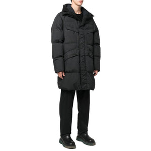 Elevate your outerwear collection with the iconic Stone Island Long Black Nylon Down Jacket. Experience unparalleled warmth with its sumptuous down and feather filling all wrapped in garment-dyed ruched fabric for a unique aesthetic edge. The jacket boasts four large front pockets secured with button closures, while a robust zipper and Velcro fastening ensures you’re shielded from the elements in style. A drawstring hood offers additional protection, making this Stone Island piece a must-have for the urban explorer.