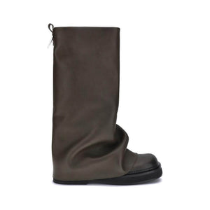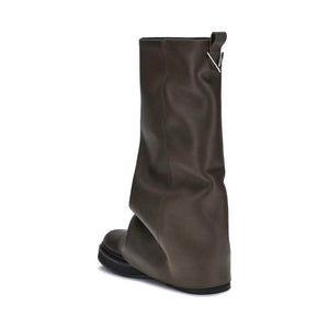 The Robin Boots by The Attico are a statement style that fuses sculptural design and refined details. Featuring an overlapping draped panel, they lend movement and a couture touch to the silhouette. On the back, the logo plaque and tongue add a distinctive element. Completing the design is the leather and rubber sole and the firm, block heel. A pair of boots that combines style and personality with boldness.