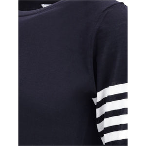 Thom Browne’s knit T-Shirt is a garment with a clean and distinctive style. With a ribbed crew neck and hems, it features the brand’s iconic bands on the left sleeve, a detail that underscores its unique identity. The ribbed hem with slight side slits adds a touch of modernity and comfort, making it perfect for a casual yet sophisticated look. A versatile must-have for any wardrobe.