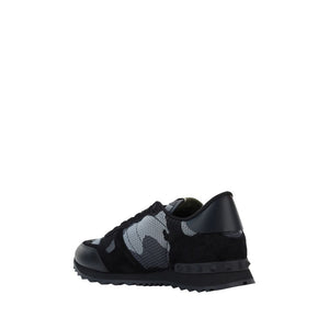 Sneakers by Valentino Garavani, lace-up front closure, round toe, leather detailing, textured knurled sole, iconic brand studs at heel, camouflage effect design, logoed insole.