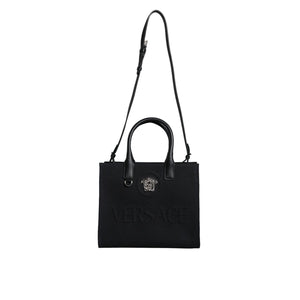 Versace Black Top Handle Canvas Leather Logo Crossbody Tote Bag