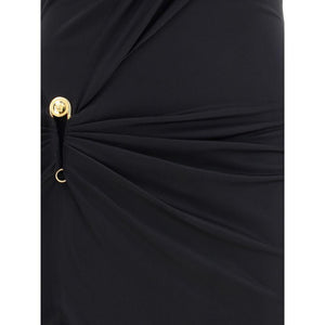 Versace’s Sleeveless jersey Dress is a draped design that elegantly enhances the silhouette. Featuring a soft neckline, it is embellished with iconic details: golden logo pins applied on the front and shoulder, recalling the Maison’s bold and sophisticated aesthetic.