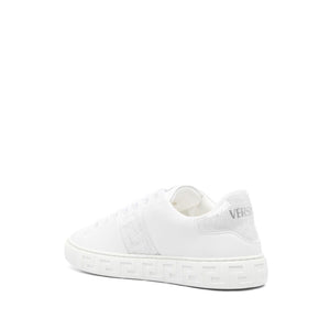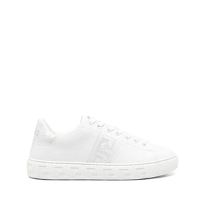 white faux leather smooth grain bead and sequin logo detail logo-embossed signature Greca detailing logo patch at the tongue branded heel counter front lace-up fastening round toe branded insole flat rubber sole Greca sequined sneakers Size and Fit - Heel 1,2 in / 3 cm, Platform 1,2 in / 3 cm