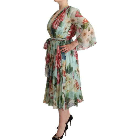 Dolce & Gabbana Green Floral Long Sleeve V-neck Midi Dress