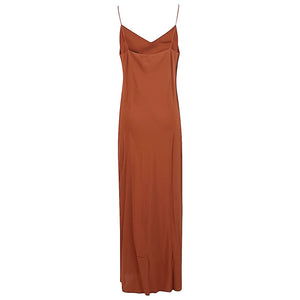Brown dress with shoulder straps, v-neck, long length. Georgette long slip dress Size and Fit - .