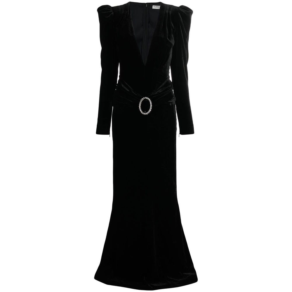 belted velvet V-neck gown from ALESSANDRA RICH featuring black, velvet, plunging V-neck, drop waist, belted waist, long sleeves, crystal embellishment, floor-length and ruched detailing. Deep neckline velvet long dress Size and Fit - This piece fits true to size. We recommend you get your regular size. Model is 1,75m / 5ft 8in wearing size 40 (IT)