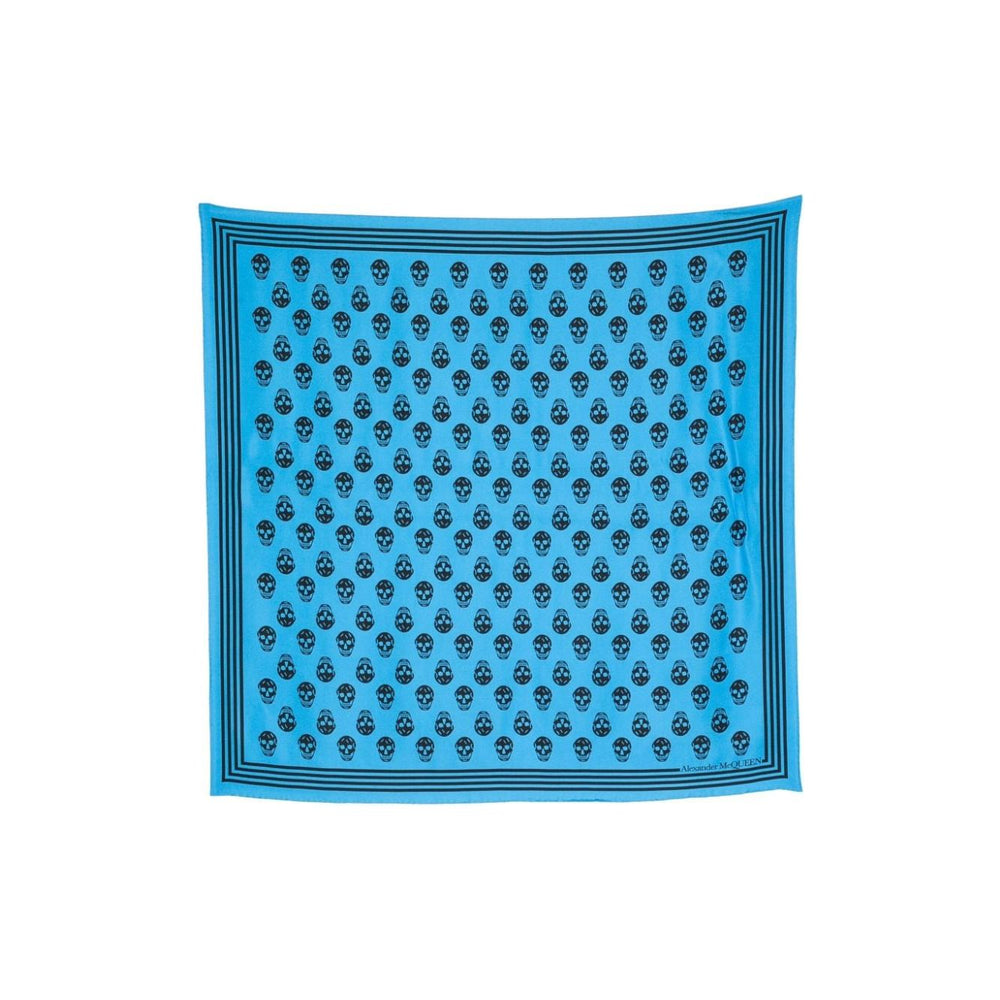cerulean blue, black silk square shape skull print stripe detailing logo-print edge finished edge Skull silk scarf