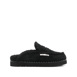 black leather suede textured finish slip-on style penny slot almond toe branded insole faux-shearling lining rubber sole Genda slippers Size and Fit - Heel 1 in / 2,5 cm Platform 0,8 in / 2 cm