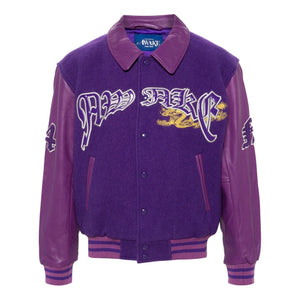 purple stretch-wool/lambskin felted multi-panel design embroidered motif classic collar front press-stud fastening long sleeves ribbed cuffs and hem two front jetted pockets Dragon embroidered varsity jacket Size and Fit - This piece fits true to size. We recommend you get your regular size. Model is 1,84m / 6ft 1in wearing size M