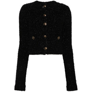 black cotton blend bouclé construction metallic threading crew neck long sleeves two front patch pockets logo-embossed buttons cropped full lining straight hem front button fastening Bouclé cropped jacket Size and Fit - BUST: 68.0 Centimetres. LENGTH: 44.0 Centimetres. WAIST: 64.0 Centimetres. SLEEVE LENGTH: 78.0 Centimetres. Shoulder Width: 36.0 Centimetres.