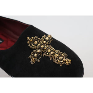 Dolce & Gabbana Black Suede Gold Cross Slip On Loafers Shoes