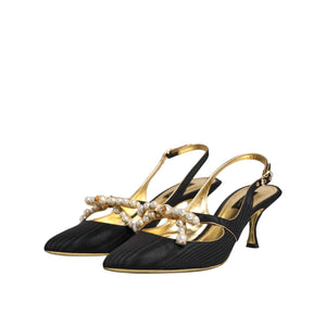 Dolce & Gabbana Black Leather Faux Pearls Slingbacks Shoes