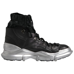 Discover the epitome of modern luxury with these Dolce & Gabbana ankle boots, crafted from the finest lambskin and nylon. Make a bold statement with the sleek black leather upper contrasted by a silver rubber sole for unmatched style and durability. The inner knee-high nylon acts as an elastic sock, ensuring comfort and an avant-garde edge. Designed in Italy, these boots redefine sophistication with their exceptional craftsmanship. Perfect for style connoisseurs who dare to stand out.