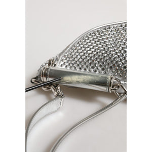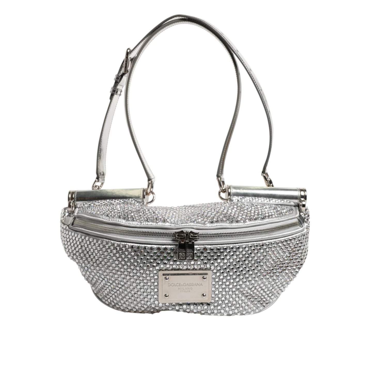 Gorgeous brand new, 100% Authentic Dolce & Gabbana Silver calf leather belt bag featuring crystal embellishment, silver-tone hardware, logo plaque, single flat top handle, adjustable waist strap, adjustable detachable shoulder strap, front zip fastening, main compartment and internal slip pocket.