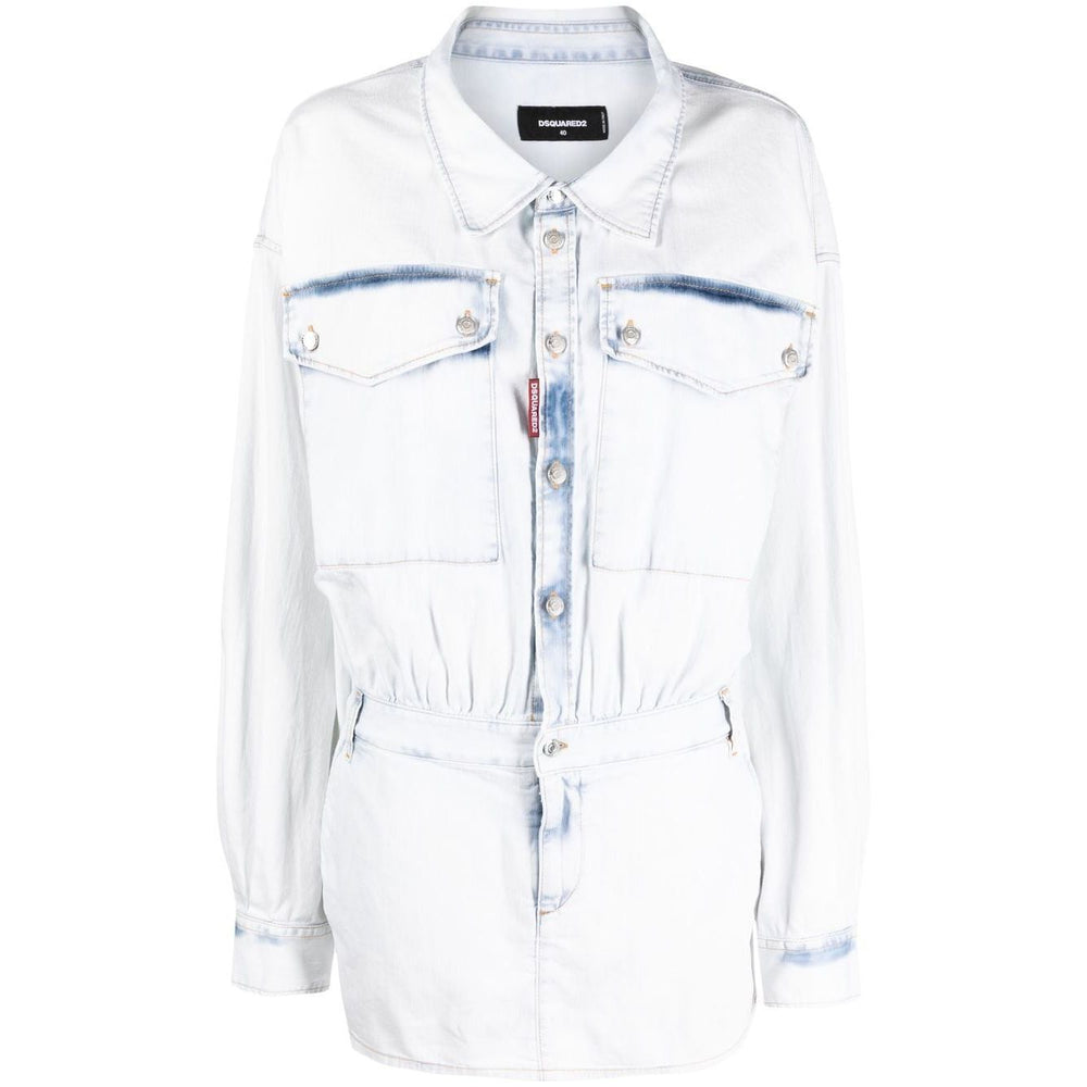 light wash denim minidress from DSQUARED2 featuring light blue, stretch-cotton, denim, light wash, two chest flap pockets, front button fastening, classic collar, long sleeves and thigh-length. Denim short dress Size and Fit - This piece fits true to size. We recommend you get your regular size. Model is 1,75m / 5ft 8in wearing size 40 (IT)