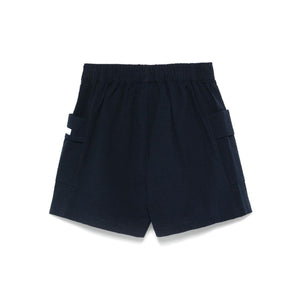 navy blue elasticated waistband two side patch pockets logo patch to the side Striped cotton shorts Size and Fit - This piece fits true to size. We recommend you get your regular size. Model is 1,75m / 5ft 8in wearing size S