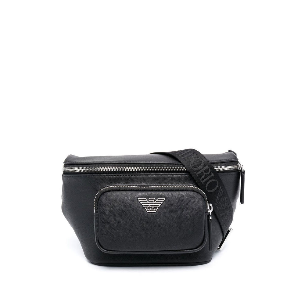 leather logo-plaque bag from EMPORIO ARMANI featuring black, calf leather, logo plaque, single shoulder strap, front zip-fastening pocket and front zip fastening. Logo belt bag Size and Fit - Width 9,84 in / 25 cm Height 5,91 in / 15 cm Depth 1,97 in / 5 cm Strap 23,62 in / 60 cm
