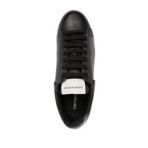 Tumbled leather sneakers from EMPORIO ARMANI featuring pebbled texture, logo patch at the tongue, branded heel counter, EVA midsole, chunky rubber sole, black, calf leather, round toe, front lace-up fastening and branded insole. Leather sneakers Size and Fit - Heel 1,6 in / 4 cm; Platform 1 in / 2,5 cm